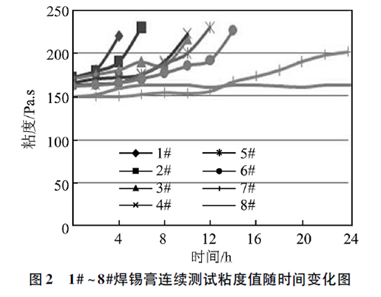 從圖2中看出,8個(gè)焊錫膏樣品的初始粘度均在150~170Pa·s之間,隨著測(cè)試時(shí)間的延長(zhǎng),除8#焊錫膏以外其他焊錫膏的粘度均增大。其中1#焊錫膏測(cè)試4h后砂化,2#焊錫膏測(cè)試6h后砂化,3#、4#焊錫膏測(cè)試10h后砂化,5#焊錫膏測(cè)試12h后砂化,6#焊錫膏測(cè)試14h后砂化,焊錫膏砂化后不再繼續(xù)測(cè)試。7#焊錫膏測(cè)試12h后粘度值開始增加,但增長(zhǎng)速率較為緩慢,8#焊錫膏在24h內(nèi)粘度值很穩(wěn)定。一般來說,焊錫膏的粘度變化幅度越大,出現(xiàn)砂化時(shí)間越短,說明焊錫膏的穩(wěn)定性越差。焊錫膏通常是需要連續(xù)印刷,連續(xù)測(cè)試焊錫膏的粘度可以間接判斷焊錫膏在連續(xù)使用過程中的穩(wěn)定性。測(cè)試時(shí)間越長(zhǎng),粘度變化越小的焊錫膏印刷時(shí)的穩(wěn)定性越好,反之,焊錫膏印刷時(shí)的穩(wěn)定性越差。