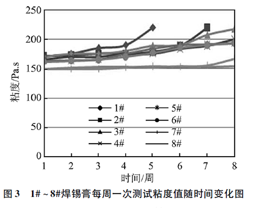 從圖3看出,1#、2#焊錫膏連續(xù)測(cè)試不到8周砂化,3#~8#焊錫膏在8周測(cè)試時(shí)間內(nèi)未砂化,但3#~6#焊錫膏粘度變化較大,粘度變化超過20%,不利于焊錫膏印刷使用。7#、8#焊錫膏粘度值穩(wěn)定,保質(zhì)期較長(zhǎng)。