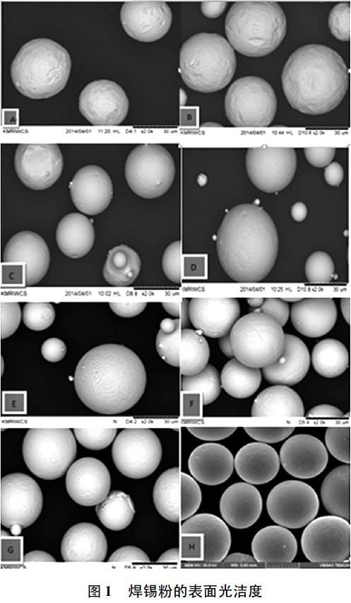 4號(hào)(20~38μm)焊錫粉是焊料市場(chǎng)的主流,本文選用不同形貌SnAg3.0Cu0.5的4號(hào)焊錫粉與同一種助焊劑配制成焊錫膏進(jìn)行測(cè)試。將不同形貌的焊錫粉編號(hào)為A~H,焊錫粉放大2000倍的表面光潔度如圖1所示,SEM圖中從A到H焊錫粉的表面逐漸光滑。將A~H焊錫粉與同一助焊劑配制焊錫膏編號(hào)為1#~8#,選用綜合性能較好,且已投入生產(chǎn)的A500助焊劑與各種焊錫粉配制焊錫膏。配制焊錫膏的工藝參數(shù)完全相同,即助焊劑A500質(zhì)量百分比11.5%,焊錫粉質(zhì)量百分比88.5%。
